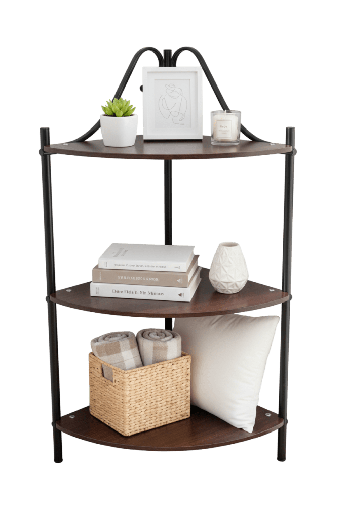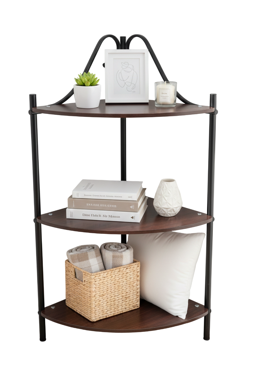 Esquinero decorativo fabricado en tubo redondo 3/4″ con acabados en pintura en polvo electrostática horneable y 3 entrepaños en MDF.