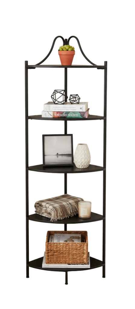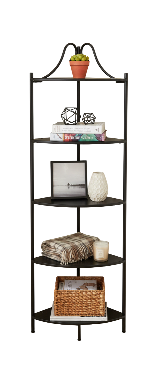 Esquinero decorativo fabricado en tubo redondo 3/4″ con acabados en pintura en polvo electrostática horneable y 5 entrepaños en MDF.