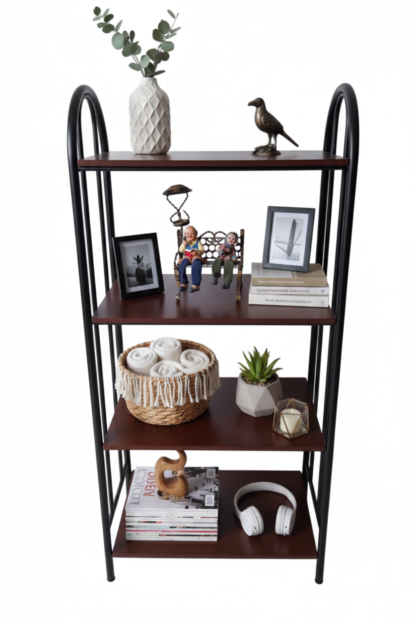 Biblioteca decorativa fabricada en tubo redondo 7/8″ con acabados en pintura en polvo electrostática horneable y entrepaños en MDF.