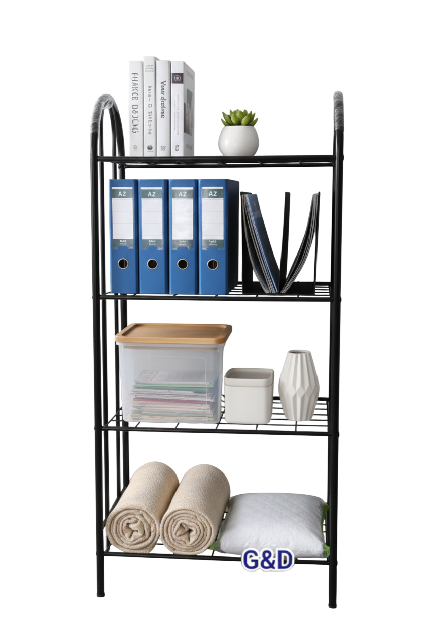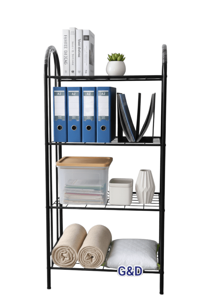 Biblioteca decorativa fabricada en tubo redondo 7/8″ con acabados en pintura en polvo electrostática horneable y entrepaños en malla de alambre galvanizado.