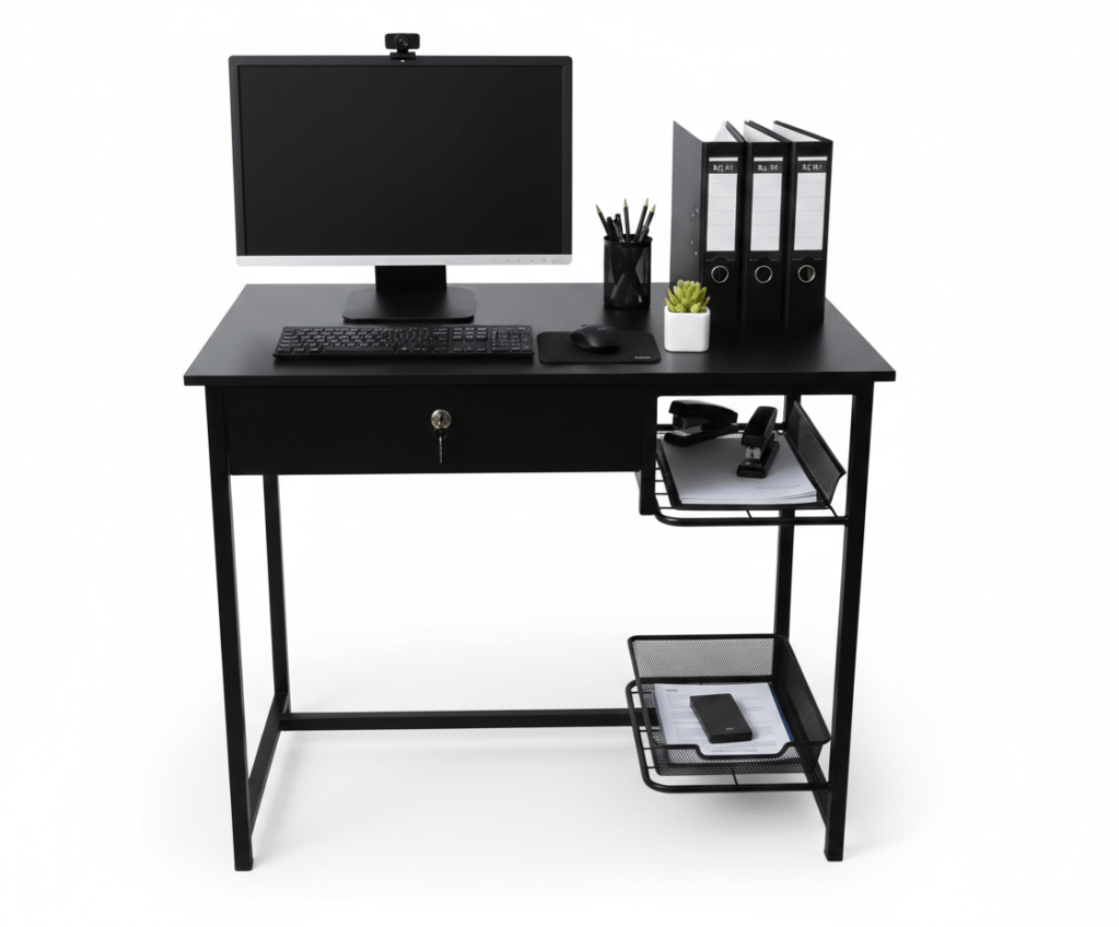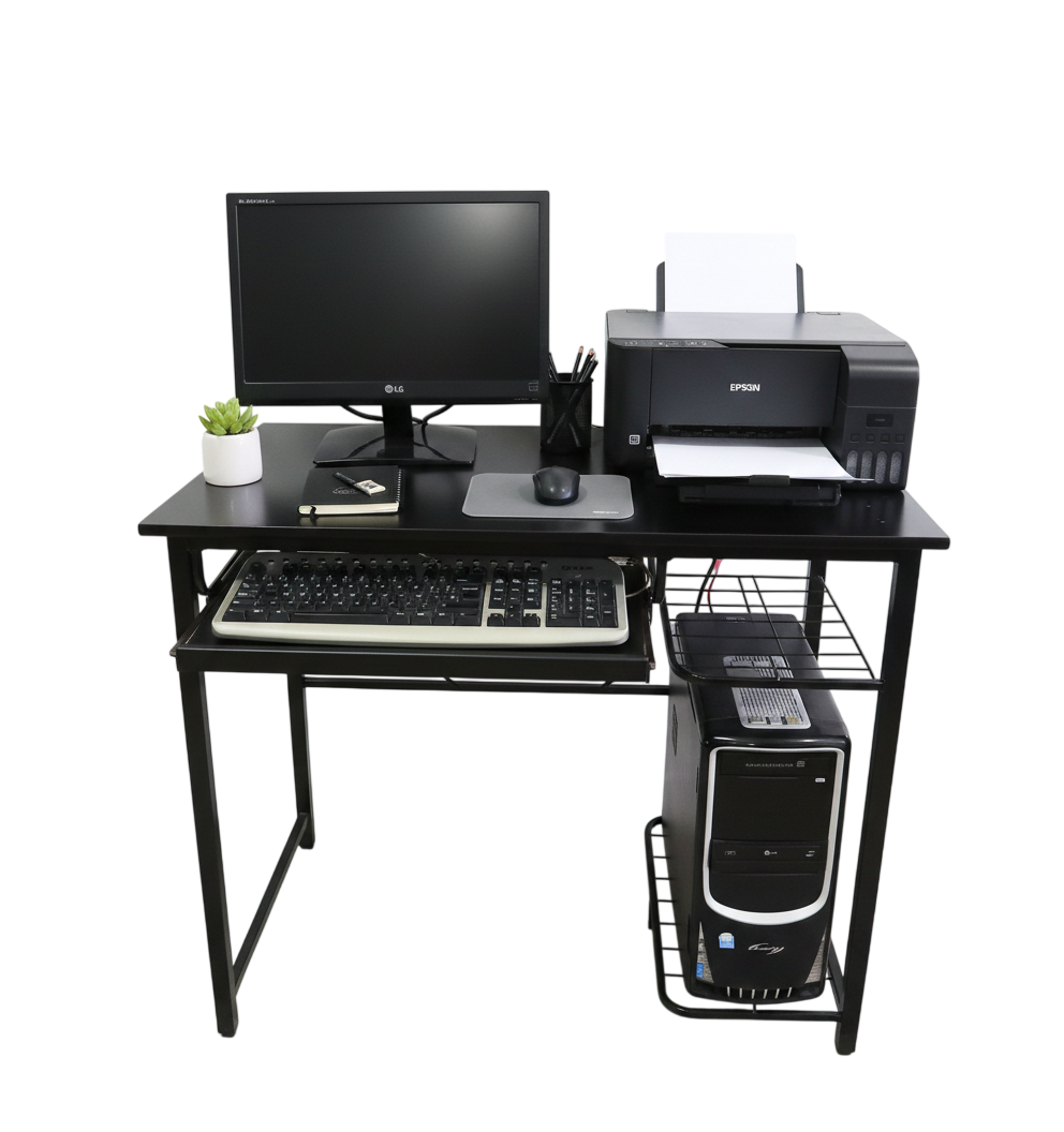 Escritorio para computador fabricado en tubo cuadrado con acabados en pintura en polvo electrostática horneable. Cuenta con porta teclado, 2 entrepaños en malla y 1 cajón con chapa.