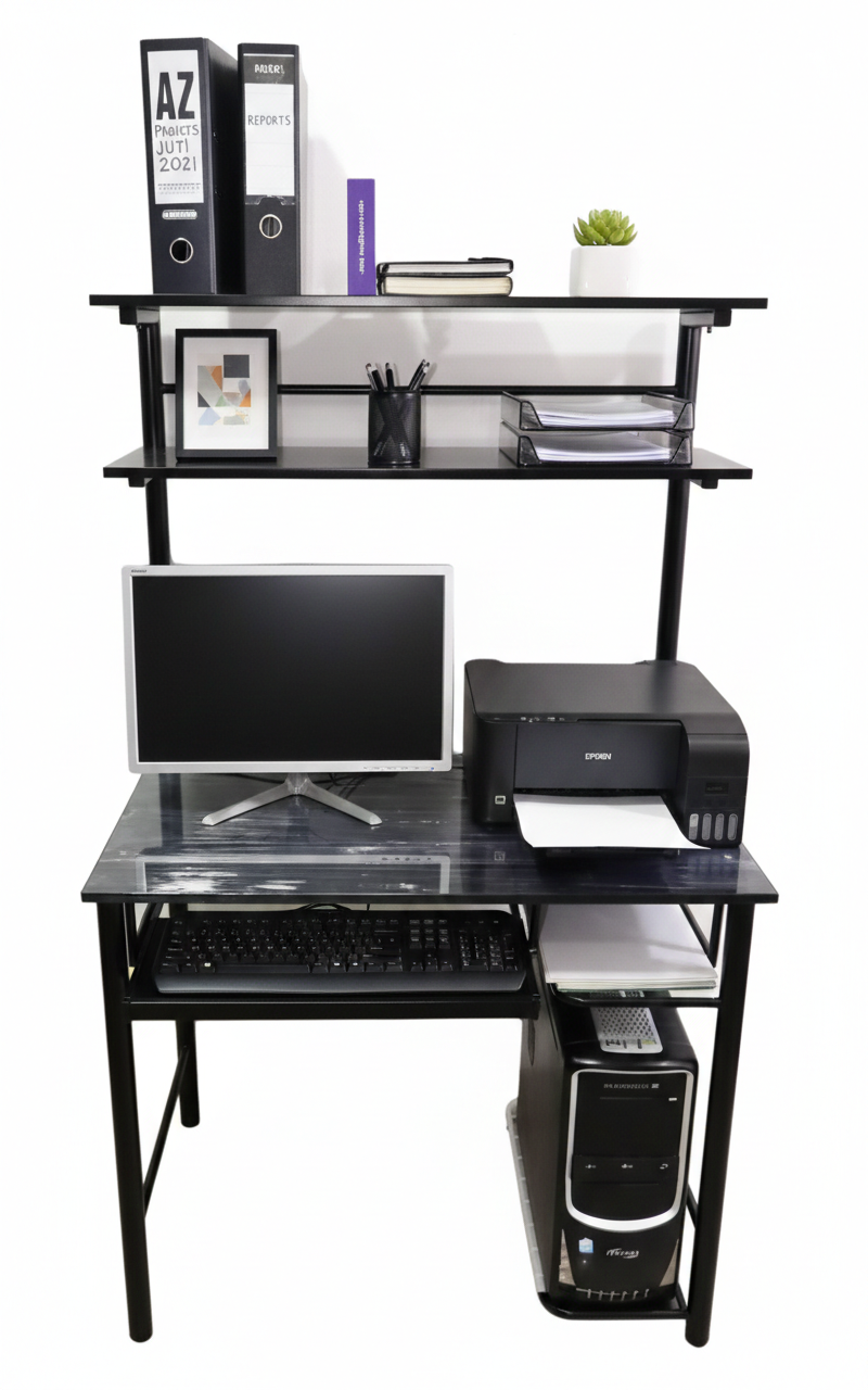 Escritorio para computador fabricado en tubo cuadrado con acabados en pintura en polvo electrostática horneable. Cuenta con porta teclado y 2 entrepaños en malla.