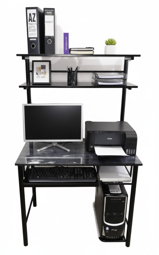 Escritorio para computador fabricado en tubo redondo 1 1/2″ con acabados en pintura en polvo electrostática horneable. Cuenta con porta teclado, 2 entrepaños en malla y 2 entrepaños en MDF.